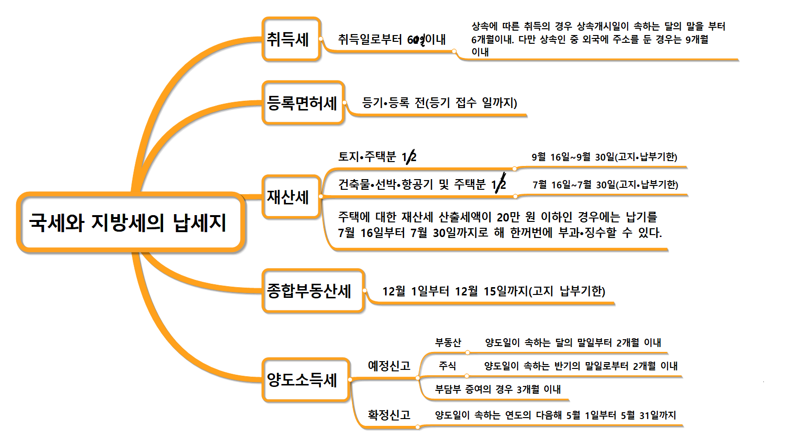 취득세는 신고 및 납부기한이 취득일로부터 60일 이내이다. 상속에 따른 취득의 경우 상속개시일이 속하는 달의 말일부터 6개월 이내이다. 다만 상속인 중 외국에 주소를 둔 경우는 9개월 이내이다.