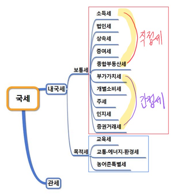 내국세는 우리나라 영토 내에서 사람이나 물건에 대하여 부과하는 세금으로 국세청에서 담당한다. 관세는 재화가 국경을 통과할 때 부과하는 세금으로 관세청에서 담당한다. 내국세에는 소득세, 법인세, 상속세와 증여세, 부가가치세, 개별소비세, 주세, 인지세, 증권거래세, 교육세, 교통세, 농어촌특별세, 종합부동산세 등이 있다. 국방, 치안, 도로, 철도, 국민복지 등 국가의 살림살이를 위한 재정 수요를 충당하기 위해 국민에게서 거둬들이는 세금을 말한다.