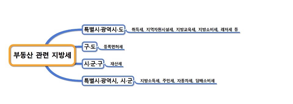 지방세는 토지, 건축물, 차량, 기계장비, 항공기, 선박, 입목, 어업권, 광업권, 골프회원권, 승마회원권, 콘도미니엄회원권, 종합체육설이용회원권 등을 매수할 경우 내야 하는 지방세는 취득세가 있고, 부동산, 선박, 자동차, 건설기계, 항공기, 광업권 및 조광권 어업권 등을 등록할 때 내는 등록면허세 등이 있으며, 부동산을 보유하는 세금으로 토지, 건축물, 주택, 항공기, 선박에 부과하는 시•군세인 재산세가 있다.