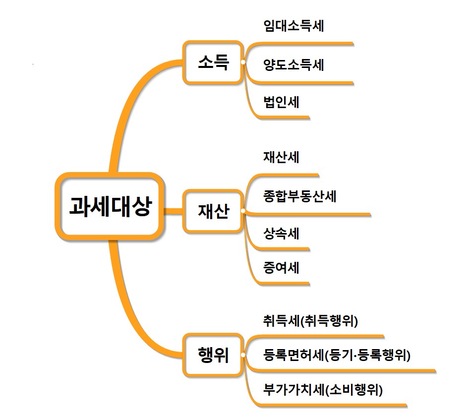 과세대상은 과세객체라고도 하는데 말 그대로 세금을 부과할 수 있는 대상을 말한다. 소득세의 과세대상은 개인의 소득, 법인세의 과세대상은 법인의 소득, 그리고 부가세의 과세대상은 재화•용역의 공급 및 재화의 수입이다. 과세 대상은 소득을 대상으로 할 때도 있고, 재산을 대상으로 할 때도 있고, 행위를 대상으로 할 때도 있고, 소비를 대상으로 할 때도 있다. 예를 들어 토지•건축물의 취득행위는 취득세 과세대상으로 취득세를 납부해야 하며, 토지•건축물은 재산세 과세대상이므로 재산세를 납부해야 한다. 그리고 토지•건축물을 양도하면서 발생하는 양도차익은 양도소득세 과세대상으로 명시되어 있으므로 양도소득세를 납부해야 한다. 건축물은 재산세 과세대상이지만 종합부동산세 과세대상이 아니므로 종합부동산세 납세의무는 없다. 사업용으로 쓰이는 토지는 과세대상(별도합산과세 대상)이지만 공시가격 80억원이 넘어야 과세된다. 그래서 대부분이 상가는 종합부동산세의 납세의무가 생기지 않는다. 소득이라는 것은 우리가 돈을 버는 것을 말하는데 돈을 벌었을 때는 세금을 내야 한다. 예를 들어서 부동산을 취득해서 임대를 하면 임대료가 들어오는데 그 임대료 수입은 임대소득이 된다. 과세관청은 그 임대료 수입의 소득을 과세대상으로 해서 과세할 수 있다. 그리고 우리는 아파트를 팔아 발생하는 소득에 대해서는 양도소득세를 납부해야 한다. 우리가 시장에 가서 물건을 사는 행위를 할 때 납부하는 세금이 있는데 그것이 바로 부가가치세이다. 우리가 각종 물건을 사면 그 물건값에 10%의 세율이 부과되는데 그것이 부가가치세이다. 재산세에서 재산이라는 것은 토지, 건축물, 주택, 선박, 항공기 등을 재산이라고 말하고 종합부동산세에서는 주택과 토지를 과세대상으로 한다. 즉, 건축물, 선박, 항공기는 재산세 과세대상이지만 종합부동산세 과세대상은 아니다. 취득세에서 말하는 취득이라는 것은 분양을 받는다던가 경매로 낙찰을 받는다거나 아니면 급매로 물건을 사는 것인데 이 모든 것을 다 취득이라고 말하며 이런 취득을 할 때 우리는 납세의무가 발생된다.