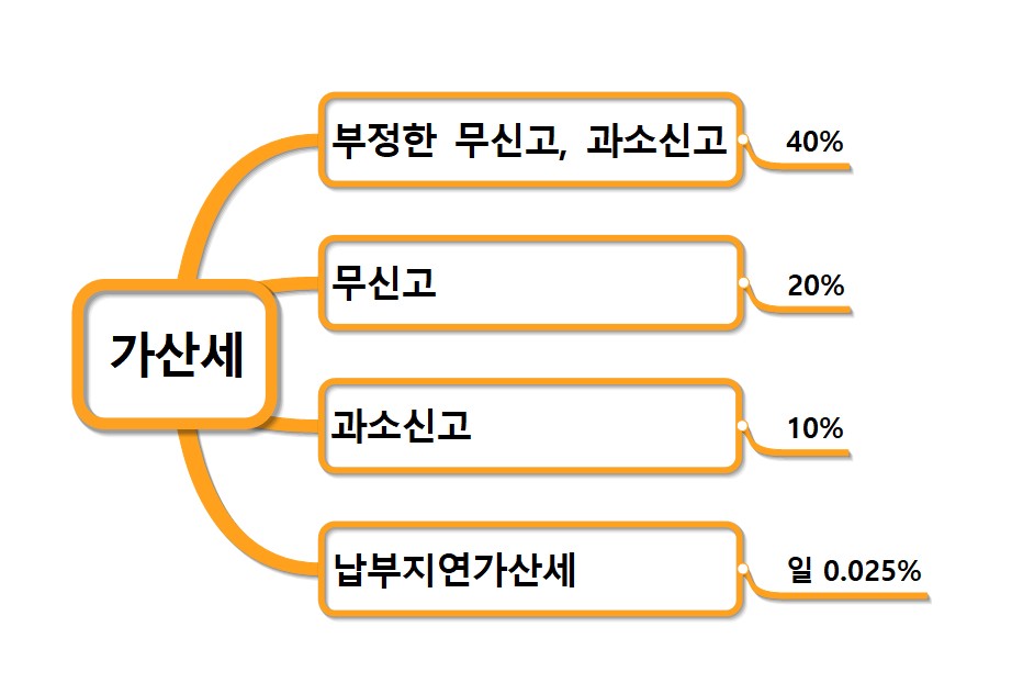 가산세율은 일반 무신고의 경우 즉 모르고 신고했을 때는 20% 가산세가 붙고 일반 과소신고의 경우 즉, 신고는 했는데 금액이 적은 경우는 10%의 가산세가 붙는다. 그리고 부정한 무신고, 부정한 과소신고는 40%의 가산세가 붙는다. 부정하다 라는 것은 고의적으로 일부러 신고를 안 한 거기 때문이다. 예를 들어, 신고 납부할 세금이 100만원인데 과소신고했다면 10만원이 가산세로 붙고 무신고는 20만원이 붙고 부정 할 때는 40만원이 붙게 된다. 신고는 했는데 납부를 미룬 경우에는 납부지연가산세가 붙는데 지방세의 경우 하루 당 0.025%씩 가산을 한다.