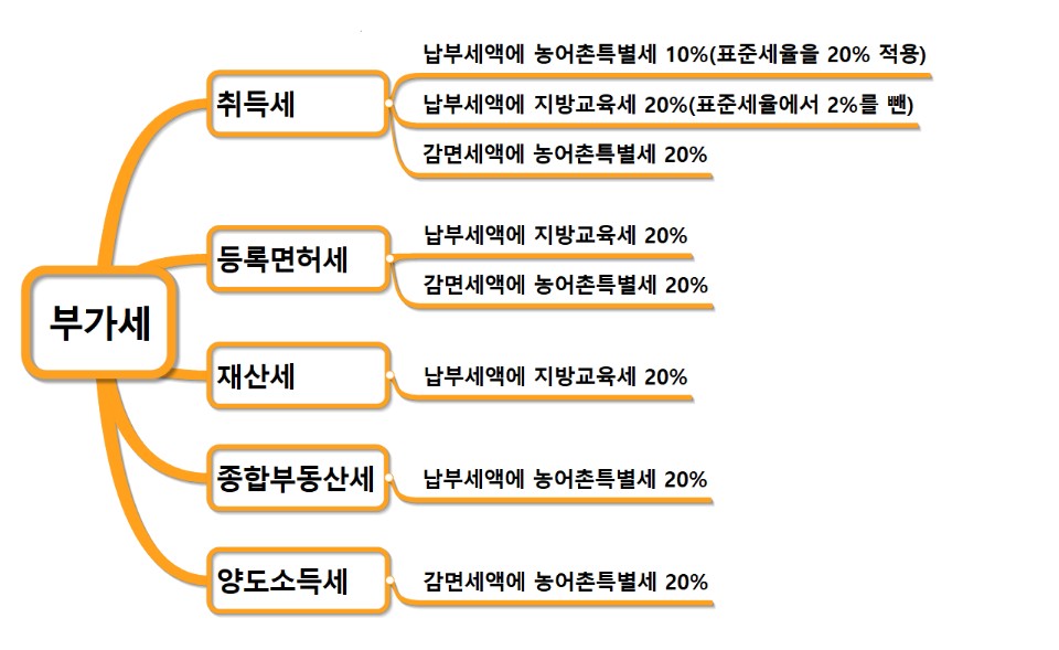 부가세는 다른 조세에 부가하여 부과되는 조세이다. 부가세는 독립세에 대립하며 독립세액의 일정비율이 부가하여 본세와 동시에 징수한다. 예를 들어, 취득세라는 본세가 발생되면 여기에 딸려 붙는 세금이 있는데 그 딸려 붙는 세금을 부가세라고 한다. 취득세에 부가되는 부가세에는 지방교육세 20%가 있고 표준세율을 2% 적용한 농어촌특별세 10%가 있다. 재산세의 부가세는 지방교육세 20%이다. 예를 들어, 재산세가 100만원이 발생했다면 이 세금에 지방교육세 20%가 붙는다. 100만원의 20%인 20만원이 부과된다. 종합부동산세의 부가세는 농어촌특별세 20%이며 종합부동산세가 100만원이라면 20만원의 농어촌특별세가 부과된다.